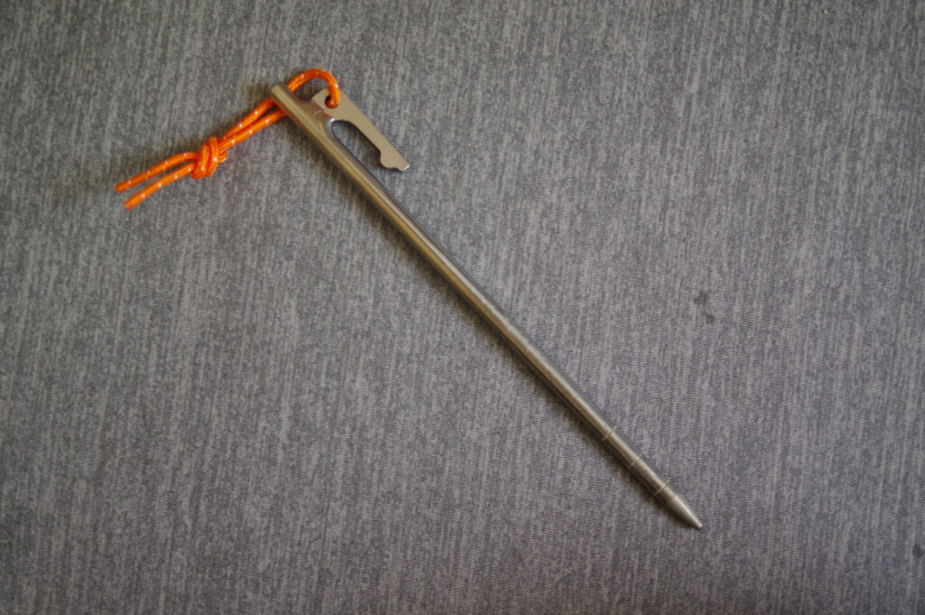 薄型形状のアルミペグ :アルミニウム製の薄型形状ペグは、収納時のコンパクトさに優れているだけでなく、薄い形状が打ち込みやすさにも貢献しています 。ただし先に解説した通り柔らかい素材の為、硬い地面には歯が立ちません。