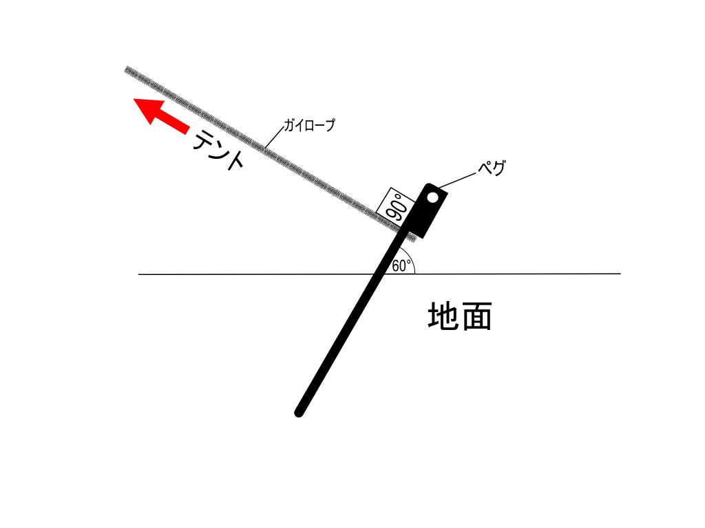ペグの角度だけでなくガイロープとの角度も重要です。ペグダウンにおいてペグとガイロープが作る角度は90度を保つことも重要です(下図参照)。