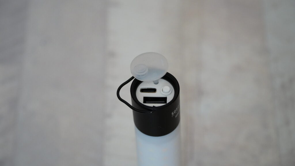本体に充電端子が備え付けのGoalZeroに対し、MINIMALIGHTは充電にケーブルが必要です。とはいえType-C端子なのでお手持ちのスマホ用ケーブルも使用可能。しかもモバイルバッテリーとして使用する際の端子はUSB-Aなので、AtoCのケーブル1本あれば充電も給電も可能です。